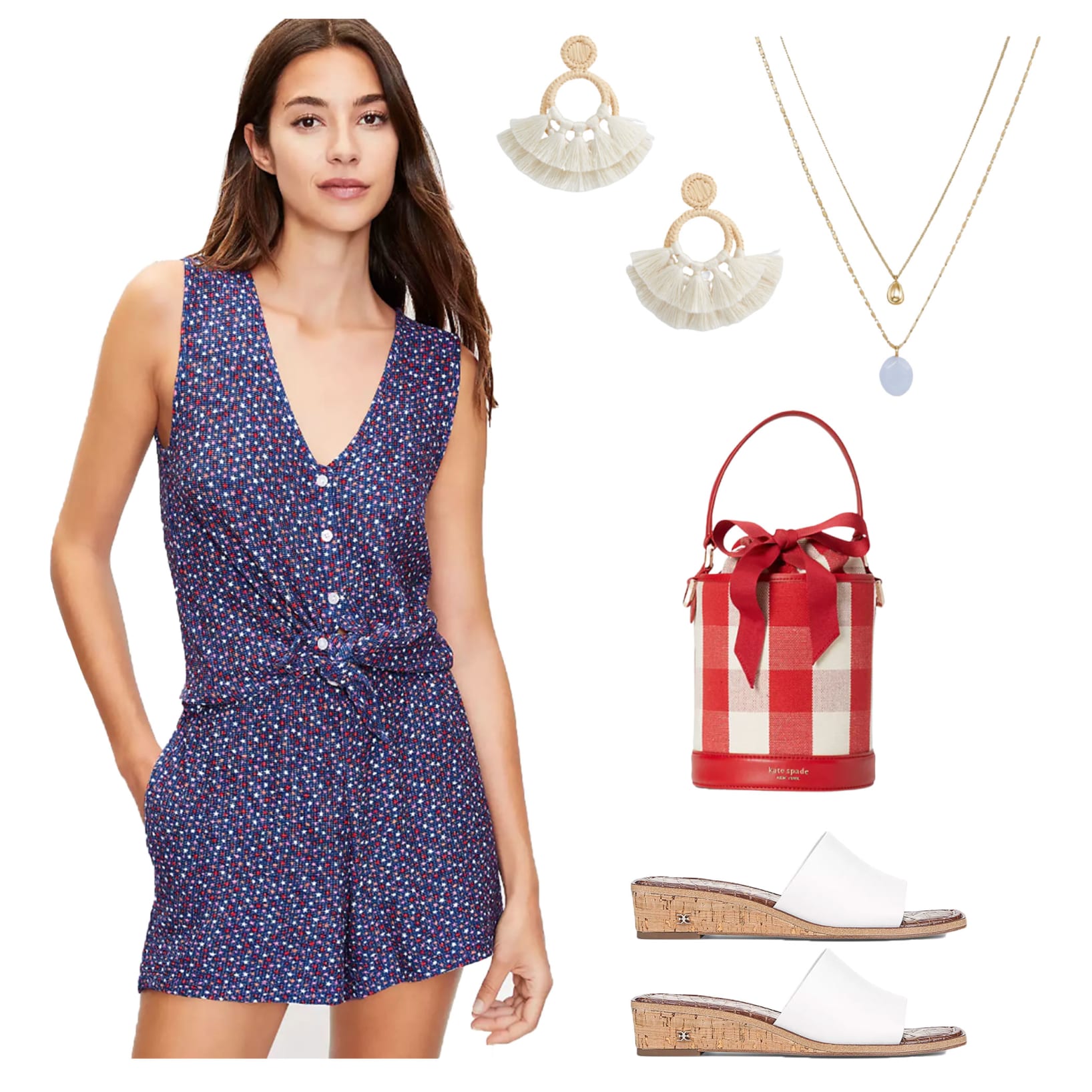Star Tie Front Top, Lou & Grey @Loft | Star Shorts, Lou & Grey @Loft | Raffia Tassel Earrings, Vineyard Vines | Layered Necklace, Universal Thread @Target | Gingham Bucket Bag, Kate Spade | Wedge Sandals, Sam Edelman @bloomingdale’s