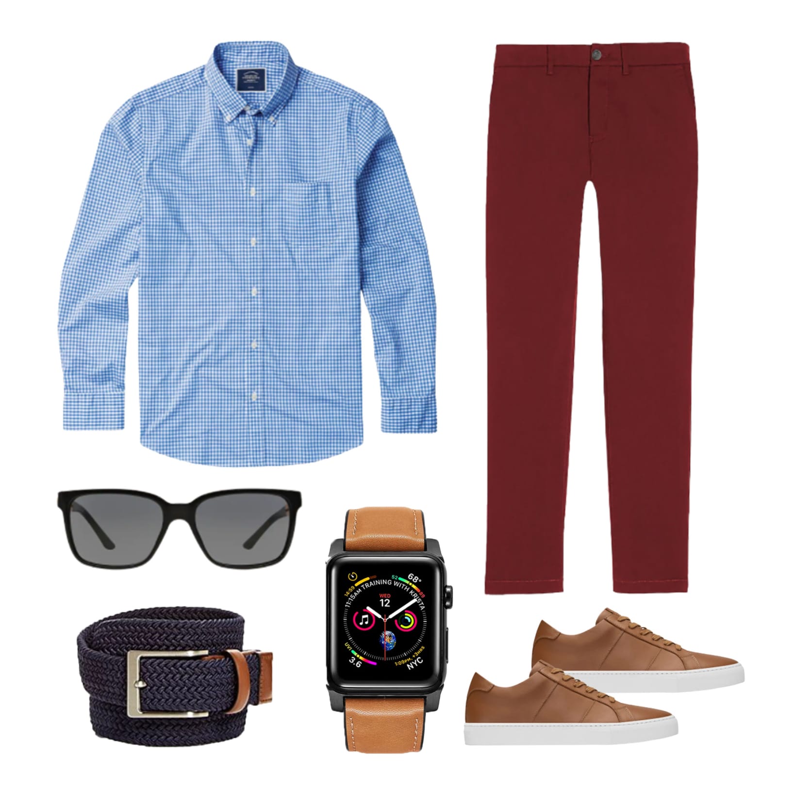 Gingham Shirt, Charles Tyrwhitt | Chino Pants, Express | Sunglasses, Versace @Sunglasshut | Belt, Bloomingdale’s | Leather Apple Watch Strap, The Posh Tech @Nordstrom | Leather Sneakers, Greats