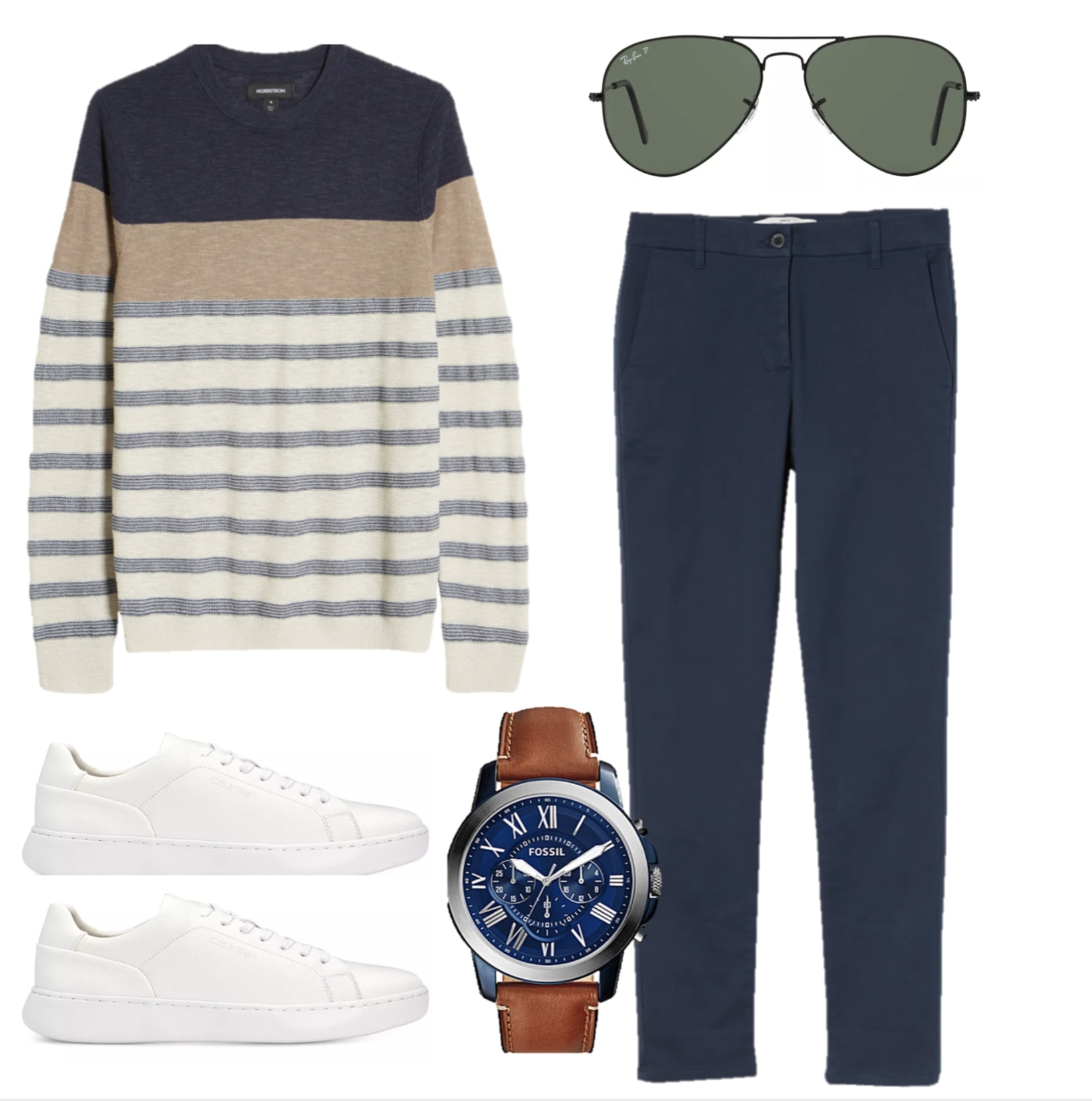 Striped Crewneck Sweater, Nordstrom | Stretch Skinny Fit Chinos, Topman @Nordstrom | Watch, Fossil @Macy’s | Slim Fit Chinos, Bonobos @Nordstrom | Sneakers, Calvin Klein @Macy’s