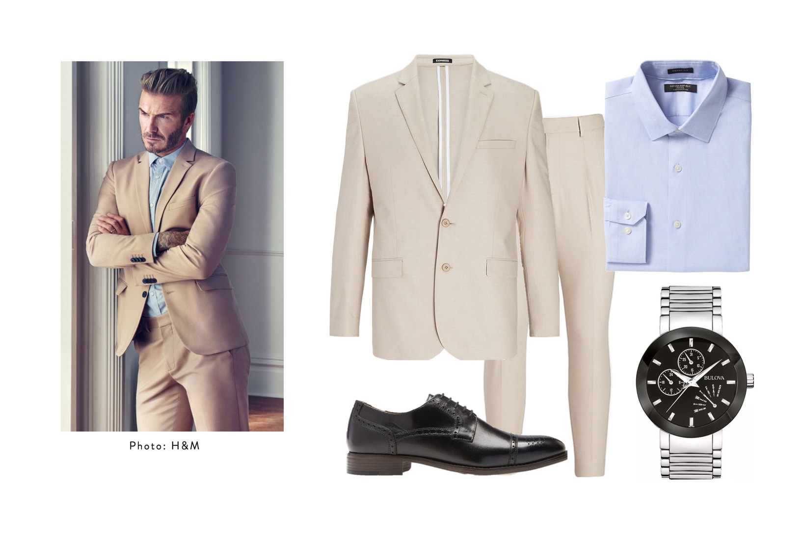 Khaki Suit Jacket, Express | Khaki Suit Pant, Express | Cap Toe Derby Shoe, Johnston & Murphy @Nordstrom | Slim-Fit Non-Iron Dress Shirt, Banana Republic | Watch, Bulova @Macy’s